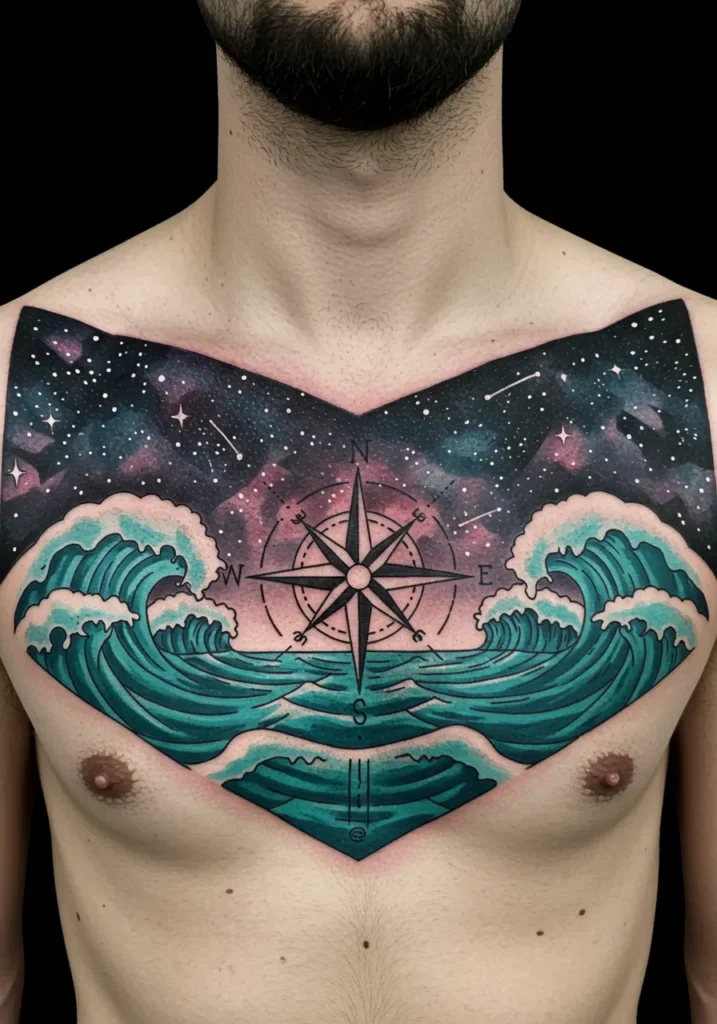 This stunning chest tattoo blends a dreamy ocean scene with a cosmic night sky, tied together by a bold compass right at the center. Deep teal waves crash dramatically against each side of the chest, while the background melts into a galaxy filled with stars, shooting comets, and soft clouds of purple and pink. The compass feels like the heart of it all, pointing in every direction, symbolizing a deep sense of purpose and wanderlust. The sharp contrast between the dark sky and the bright waves makes the whole piece feel super alive and full of energy.