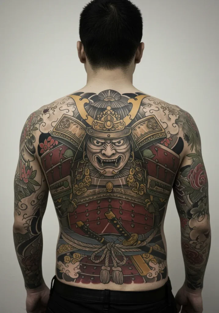 This breathtaking tattoo features a fierce samurai warrior in full battle armor, covering the entire back from shoulders to waist. The intricate detailing on the helmet, armor plates, and twin swords is just unreal, with shades of deep red, gold, and muted greens blending beautifully. Bold black outlines and traditional Japanese elements like swirling clouds and peeking florals frame the warrior perfectly, giving the whole design a powerful, larger-than-life presence. Every inch feels like a tribute to strength, honor, and fearless spirit.