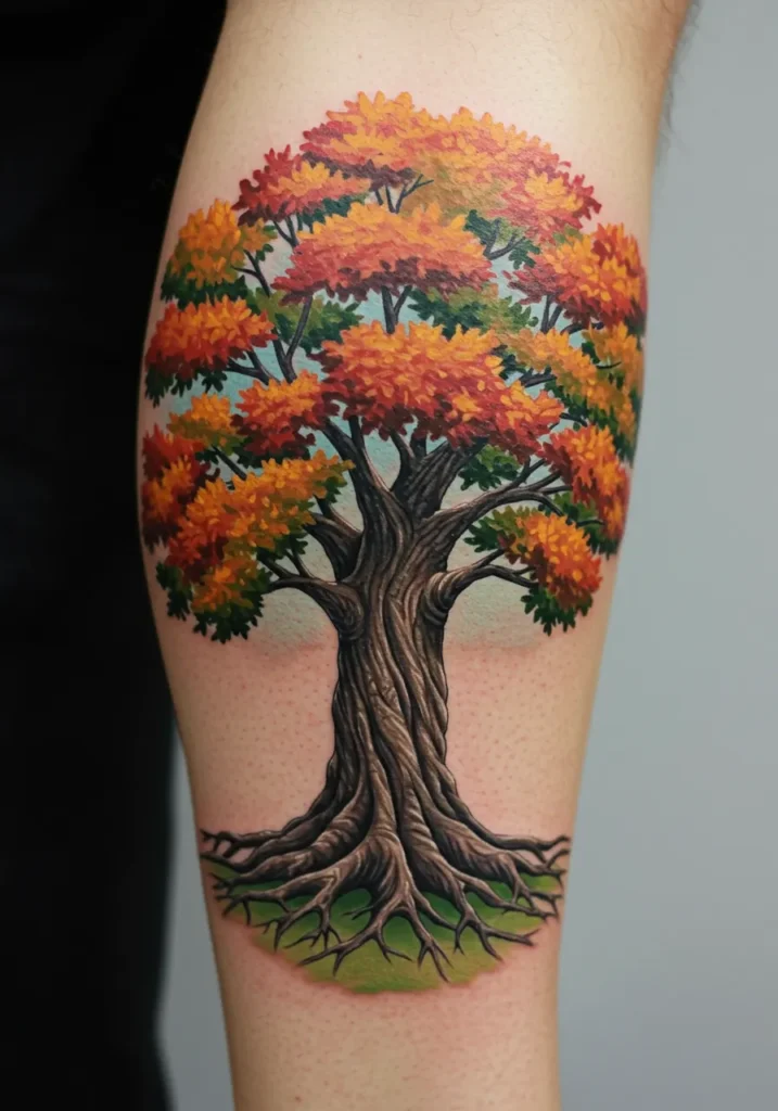 This tattoo shows a majestic tree standing tall and proud, its thick trunk filled with deep grooves that make it feel almost lifelike. The branches stretch wide, holding clusters of vivid leaves bursting in warm shades of orange, yellow, and red. A little patch of grassy earth anchors the roots, and the soft blue sky peeks through the thick canopy, giving it a peaceful and grounded feel. Every detail, from the twisted roots to the fiery leaves, is packed with rich color and beautiful shading that brings the whole piece to life.