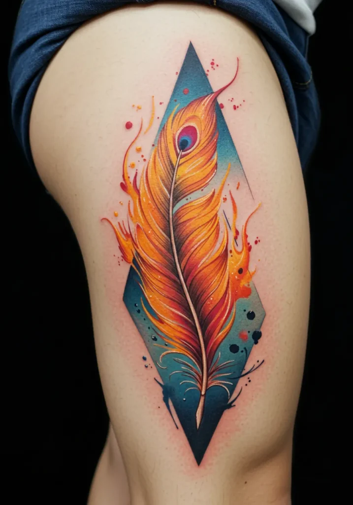 This vibrant thigh tattoo shows a fiery peacock feather floating inside a sharp diamond-shaped frame. The feather blazes in bold shades of orange, red, and gold, with a hint of deep purple right at the center eye. Around the edges, little splashes of black and blue ink create this fun, playful energy that makes the whole piece feel alive. The background fades from deep teal at the bottom to a soft blue near the top, giving the bright colors even more punch without stealing the spotlight.