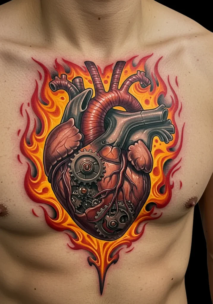 Okay, seriously, how amazing is this tattoo? I m totally in love with how the artist mixed the very real looking heart with those super cool mechanical gears. It s such a smart and eye catching design. It feels like it could symbolize so many things, maybe a heart that s full of fiery passion but also strong and engineered to keep going, no matter what. And those flames just bring so much energy! I just think it s a breathtaking piece that s both beautiful and a little bit edgy, perfect for someone who wants to make a statement.