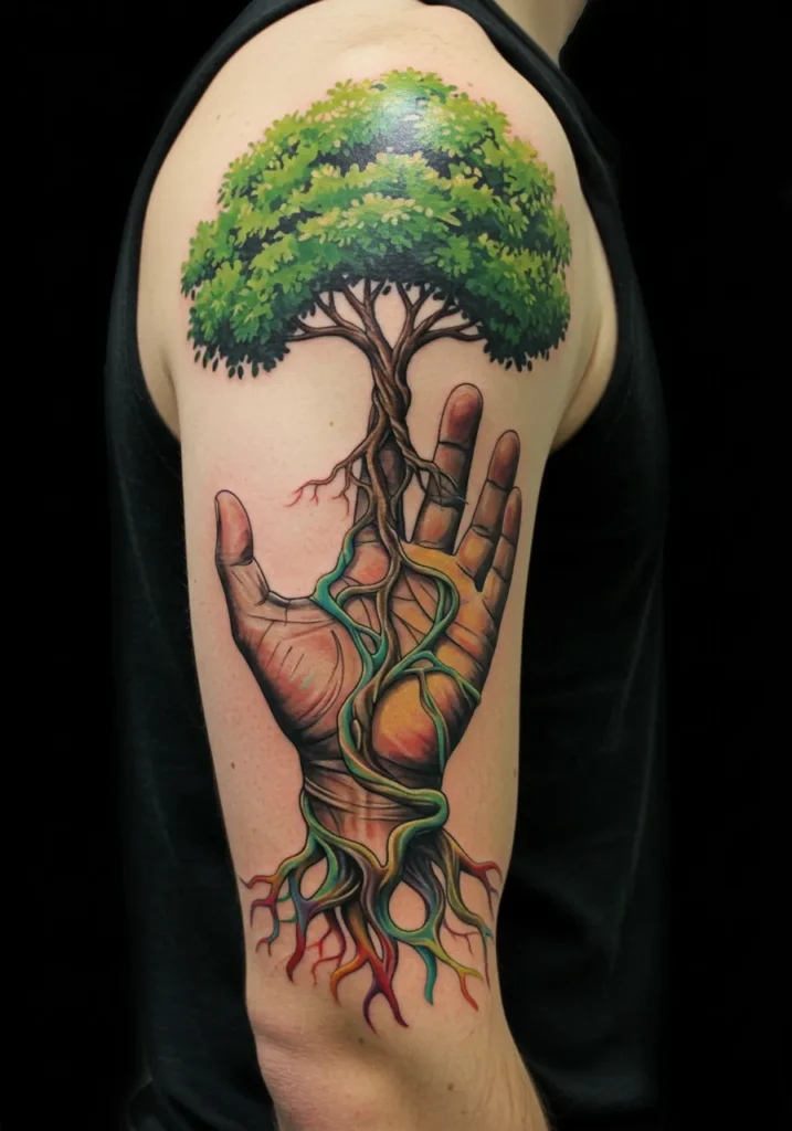 This striking upper arm tattoo presents a captivating scene of a large, open hand, seemingly cradling and giving life to a flourishing tree. The tree s rich green leaves spread across the shoulder cap, while its sturdy brown trunk emerges from the palm, with roots intricately wrapping around the fingers and extending down the arm. What s really eye catching is how these roots transform in color, shifting from earthy browns near the hand to a beautiful spectrum of blues, yellows, and reds as they trail downwards. The hand itself is detailed with warm skin tones and subtle shading, giving the whole piece a dynamic, illustrative quality, leaning towards a New School or Neo Traditional aesthetic with its bold lines and vivid coloration.