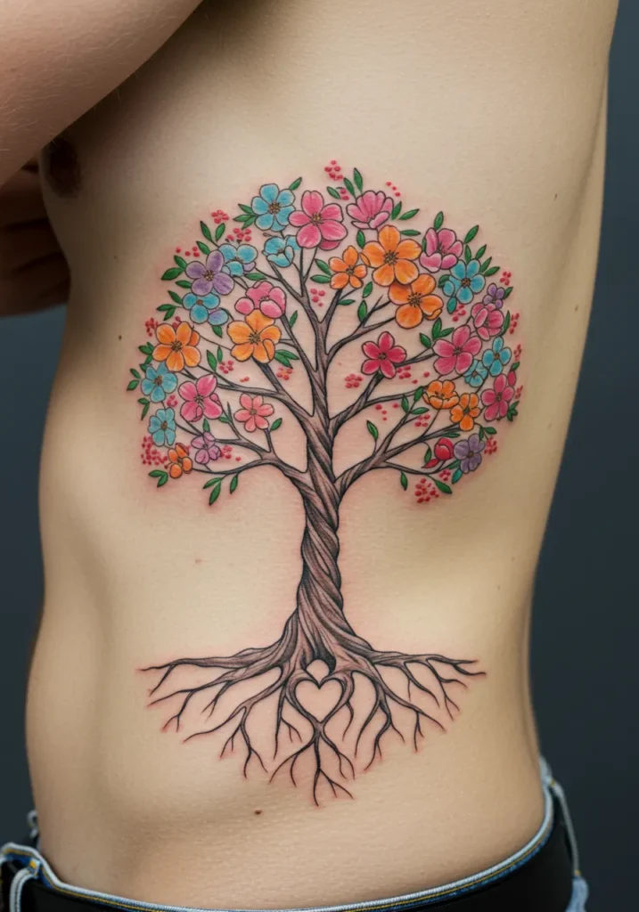 This bright and cheerful ribcage tattoo shows a slender tree blooming with dozens of colorful flowers in shades of pink, blue, orange, and purple. The branches twist and spread out gracefully, almost like a watercolor painting, while the roots weave into a delicate heart shape right at the base. Soft green leaves and tiny berries are tucked in between the blossoms, giving the whole design a sweet and lively feel without ever feeling too crowded or heavy.