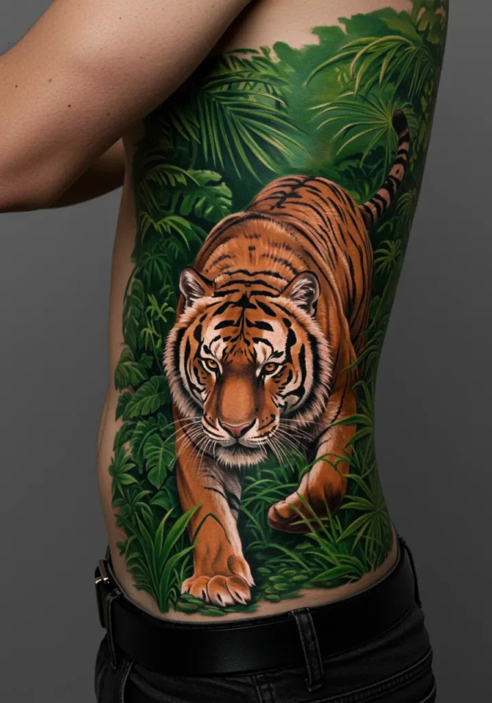 This absolutely stunning tattoo covers a large area of the side and back, depicting a magnificent tiger stepping out from a dense, lush jungle. The realism is incredible, with every stripe on the tiger s fur, the gleam in its intense eyes, and the detailed leaves of the jungle foliage rendered with amazing precision. The colors are super rich and vibrant, with the tiger s fiery orange contrasting beautifully against the deep greens of the surrounding plants, creating a truly immersive and lifelike scene.