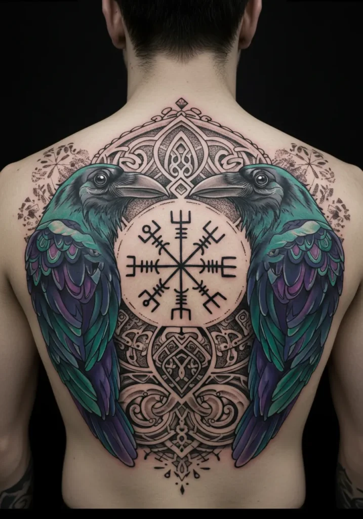 This epic full back tattoo shows two powerful ravens perched on either side of a large Norse protection symbol, all framed by intricate Viking-inspired knotwork. The ravens are shaded in deep teal, purple, and blue, with each feather layered so perfectly that they almost seem to shimmer. The background is packed with swirling patterns and ancient designs that make the whole tattoo feel like a sacred tapestry. Right at the center, the black runic compass pulls your eye in and anchors the entire piece with strong, steady energy.