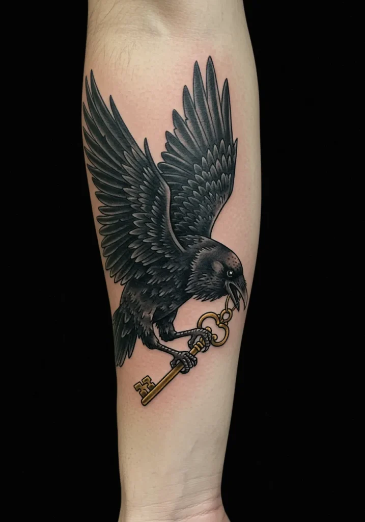 This striking forearm tattoo shows a bold black raven in mid-flight, clutching an old-fashioned golden key tightly in its talons. The feathers are shaded with such careful detail that the wings almost seem ready to lift right off the skin. The rich black of the bird pops perfectly against the softer skin tone, while the little pop of gold from the key adds just the right amount of magic and mystery. It feels dark and elegant without being heavy or overwhelming.