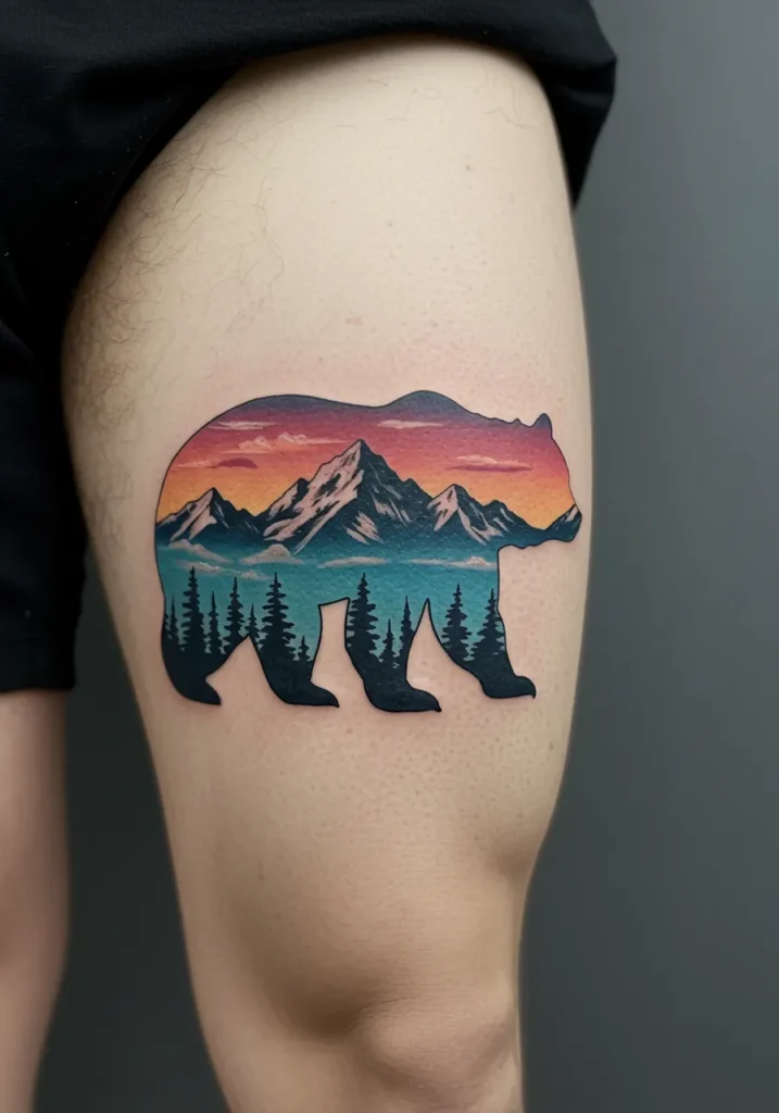 This beautiful thigh tattoo uses the silhouette of a walking bear to frame an entire breathtaking landscape. Inside the bear s shape, you can see towering pine trees, crisp snowy mountains, and a colorful sunset sky that shifts from soft orange to deep purple. The crisp black outline makes the whole design stand out so sharply against the skin, while the scenery inside feels like a little window into the wild. The colors blend so smoothly that it looks almost like a painting tucked neatly into the bear s sturdy frame.