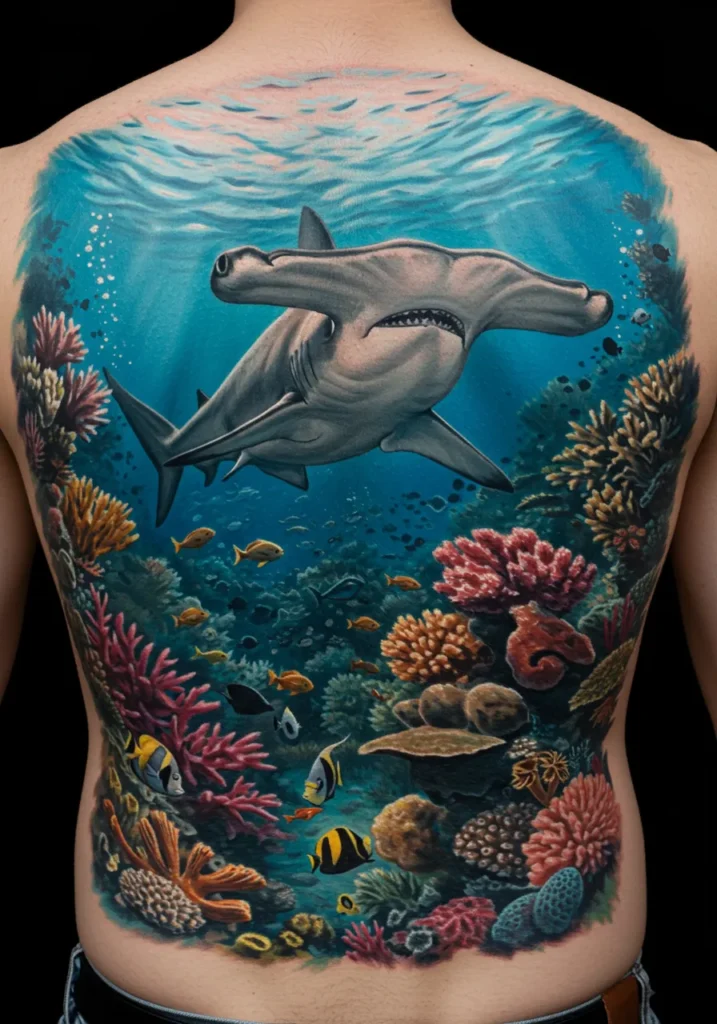 Hammerhead Shark and Coral Reef Full Back Tattoo