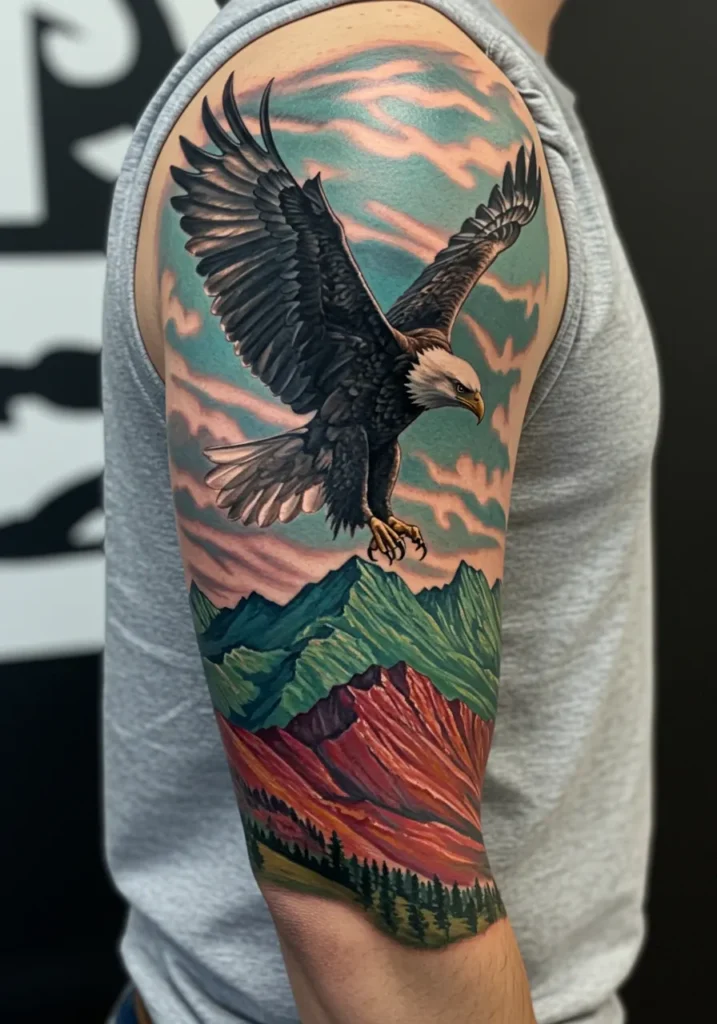 This expansive upper arm tattoo depicts a magnificent bald eagle in mid flight, its wings spread wide as it soars above a striking mountain range. The eagle is rendered with impressive realism, showcasing its detailed feathers and sharp talons. Below, the mountains are brought to life with bold, somewhat stylized colors, featuring layers of green and vibrant red, leading down to a band of dark green pine trees. The sky behind the eagle is a mix of teal and soft pinkish orange clouds, adding a painterly quality to the entire scene.