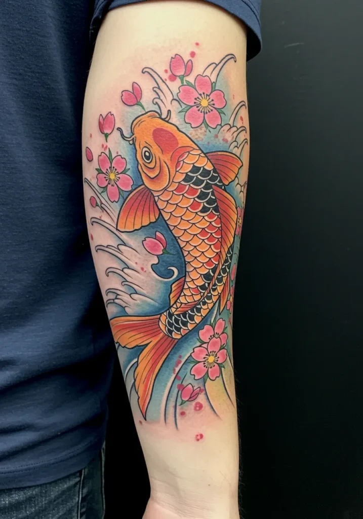Koi Fish and Cherry Blossoms Forearm Tattoo