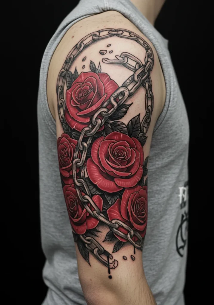 This powerful upper arm tattoo shows vibrant red roses wrapped in heavy silver chains, with one link broken at the top like a quiet little victory. The deep red petals pop beautifully against the bold black shading of the background, and the metallic texture on the chains looks so real you almost expect them to clink when you move. Tiny drops fall from the broken link, adding this raw, emotional edge that gives the whole piece even more meaning.