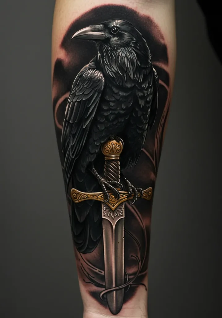 Oh my goodness, I am completely mesmerized by this design. There s such a powerful and mysterious vibe to it. I love how the raven, often a symbol of wisdom and magic, is combined with the dagger, which can represent protection or courage. The artistry is just top notch, especially the way the light catches the raven s eye and the metallic parts of the dagger. It feels like a scene from an epic story. I think it s an incredibly cool and meaningful tattoo that would definitely turn heads and spark conversations. It s both dark and beautiful, a combination I always find so intriguing.
