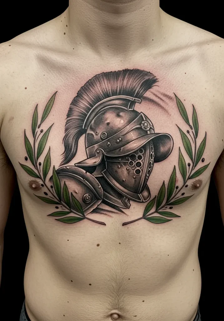 This bold chest tattoo shows a detailed Roman gladiator helmet and shield, resting side by side and framed by two leafy olive branches. The shading on the metal looks so realistic that you can almost feel the weight and battle scars carved into the surface. Soft hints of red shading around the design add a touch of warmth without overpowering the crisp black and gray work. The green olive leaves bring just the right pop of color, giving the whole piece this amazing balance between toughness and peace.