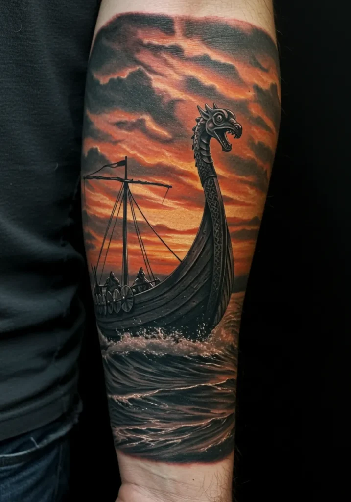 This bold forearm tattoo shows a powerful Viking ship cutting through rough waters, with a sky full of fiery orange and dark smoky clouds behind it. The dragon-headed prow stands tall and fierce, leading a crew of shadowy warriors toward whatever unknown lies ahead. The detail is just amazing, from the foamy crash of the waves at the bottom to the intricate carvings running along the ship s bow. The sunset adds this incredible feeling of intensity, like the whole scene is burning with courage and determination.