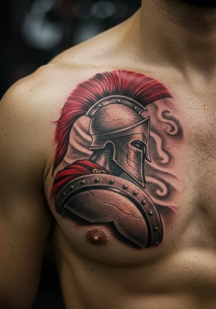 This bold chest tattoo features a powerful Spartan warrior, decked out in a cracked silver helmet and shield with a fiery red plume flowing from the top. The shading is so rich and detailed that the armor almost looks three-dimensional, like you could hear the clash of battle just by looking at it. A soft swirl of smoky shadows curls behind the figure, giving the whole piece this intense, dramatic energy without taking away from the sharp focus on the warrior.
