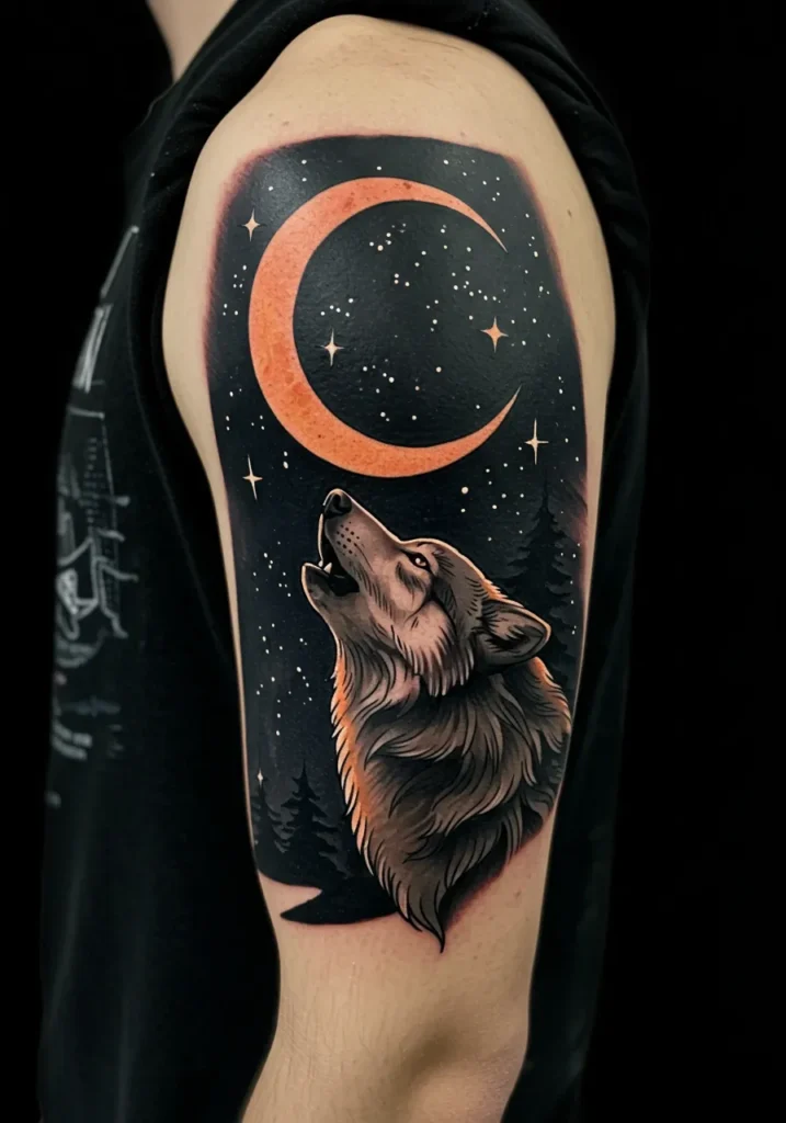 This gorgeous tattoo captures a lone wolf howling under a glowing crescent moon against a star-speckled night sky. The wolf s fur is shaded with soft browns and grays that blend beautifully into the background of dark pine trees. The moon is this striking burnt orange color that makes it pop so perfectly against the deep black sky. Little stars are scattered everywhere, adding a dreamy sparkle that ties the whole scene together. The shape fits the curve of the arm so naturally, almost like it was always meant to be there.