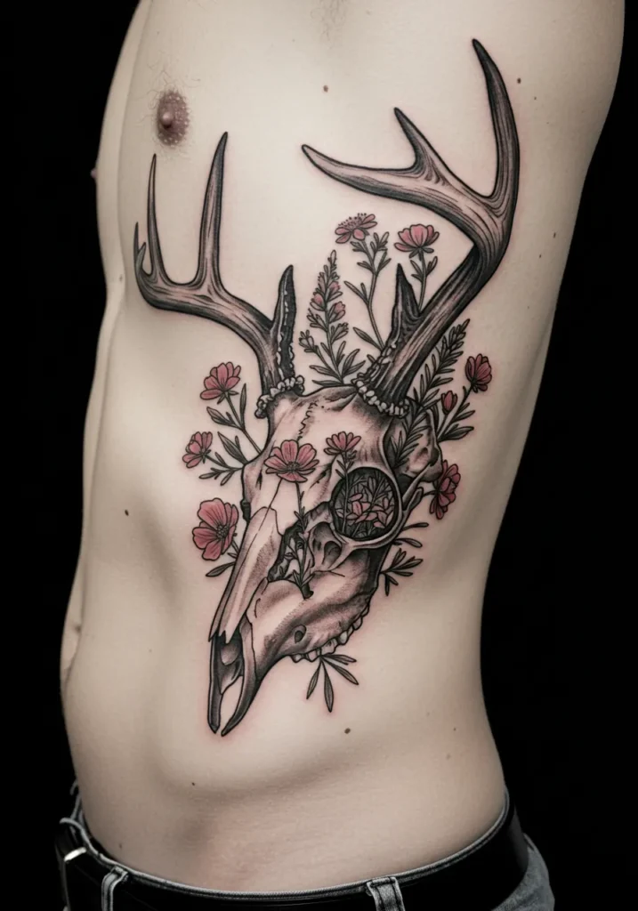 This striking rib tattoo features a beautifully rendered deer skull, complete with prominent antlers, serving as a unique vase for an arrangement of delicate wildflowers. The skull and antlers are inked with detailed shading, giving them a realistic, bony texture, while the flowers introduce soft pops of pink and greenery. What s particularly interesting is the way some flowers appear to grow through the eye socket, adding a layer of depth and symbolism. The style leans towards illustrative blackwork or neo traditional, with clean lines and a thoughtful use of color.
