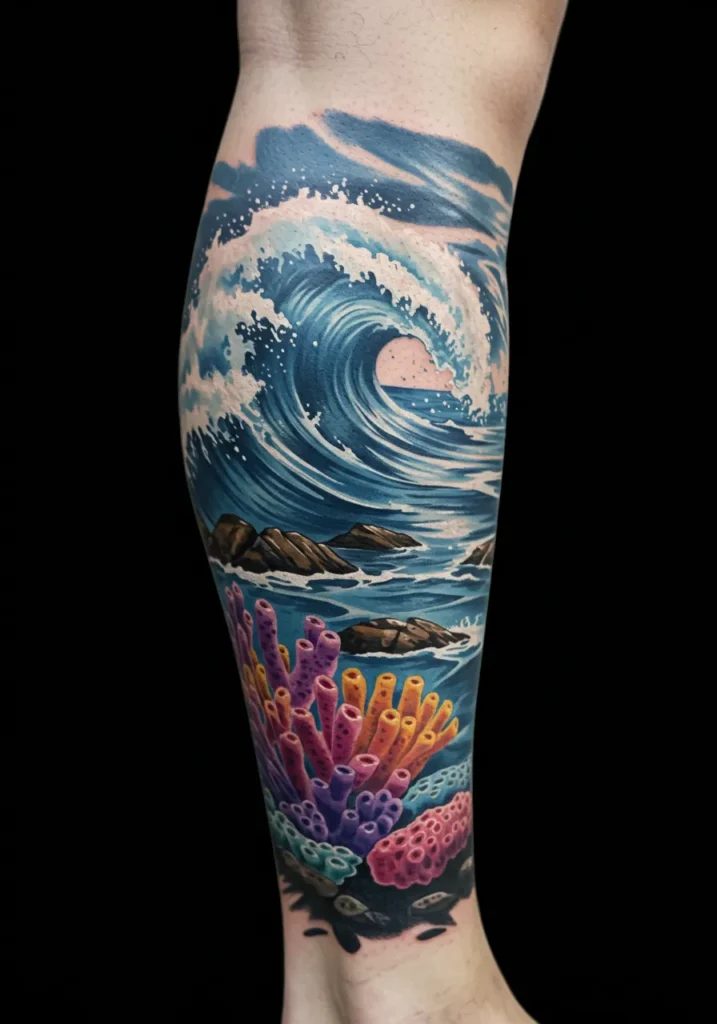 I am just so in awe of this piece. The contrast between the dramatic, almost formidable wave and the delicate, colorful coral is just breathtaking. It s like seeing two sides of the ocean s personality in one beautiful artwork. I love how the colors pop, especially those bright corals, they make me feel so happy and remind me of the hidden wonders of the sea. It s the kind of tattoo that makes you want to go on an adventure or just sit and appreciate the beauty of nature. It s a truly impressive and vibrant design that feels both powerful and serene.