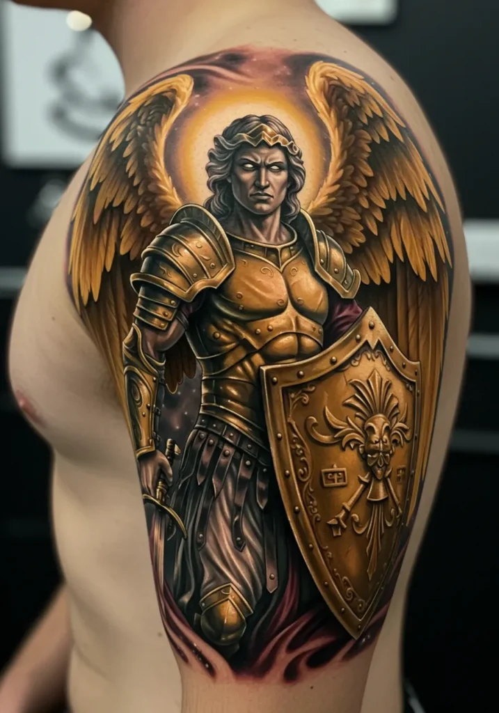 This breathtaking shoulder tattoo shows a fierce archangel standing tall in shining golden armor, holding a detailed shield with elegant engravings. Huge wings stretch out from his back, every feather drawn with such rich golden tones that they almost seem to glow. Behind the figure, a soft halo of light frames his head, giving the whole piece this powerful yet peaceful energy. The details in the armor, shield, and even the folds of the fabric are so crisp and realistic, it almost feels like he could step right off the skin.