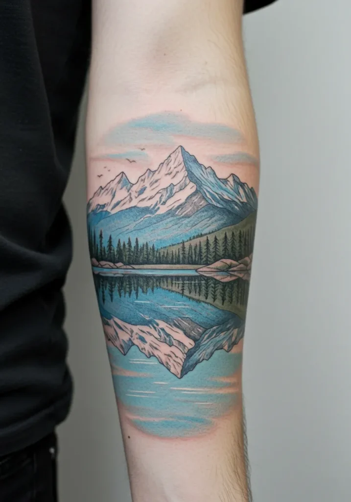 This calming forearm tattoo shows a breathtaking scene of snow-capped mountains standing tall over a glassy lake, with every detail mirrored perfectly in the water below. Soft pinks and blues in the sky blend beautifully into the deep greens of the pine trees along the shoreline. The shading on the mountains makes them feel so real, like you can almost feel the crisp air just looking at it. Everything is framed in a gentle oval shape that fits the forearm like it was made for it.