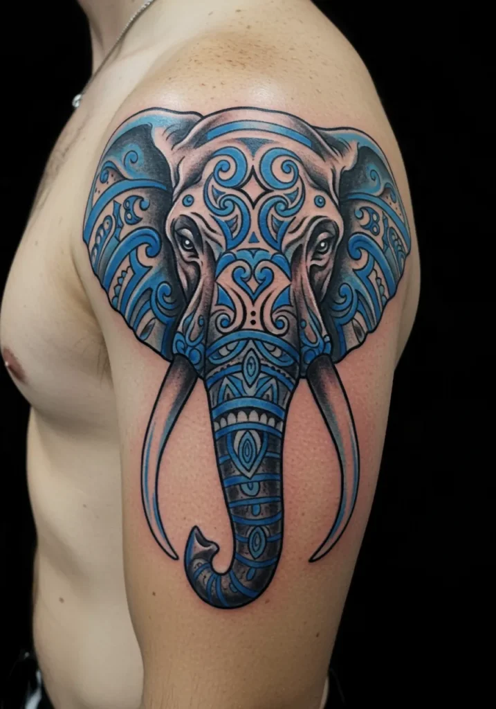 This incredible shoulder tattoo features the majestic head of an elephant, facing directly forward with a wise and gentle gaze. The elephant is adorned with intricate, flowing patterns in vibrant shades of blue, creating a stunning contrast against the softer grey tones of its skin. These beautiful designs cover its ears, forehead, and trunk, giving it a very artistic and almost ceremonial look. The tusks are smooth and prominent, framing the patterned trunk perfectly, and the eyes are rendered with a lifelike quality that really draws you in.
