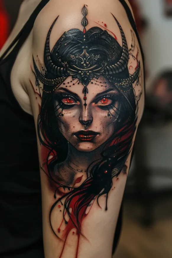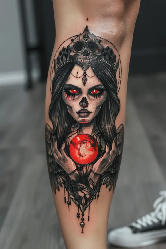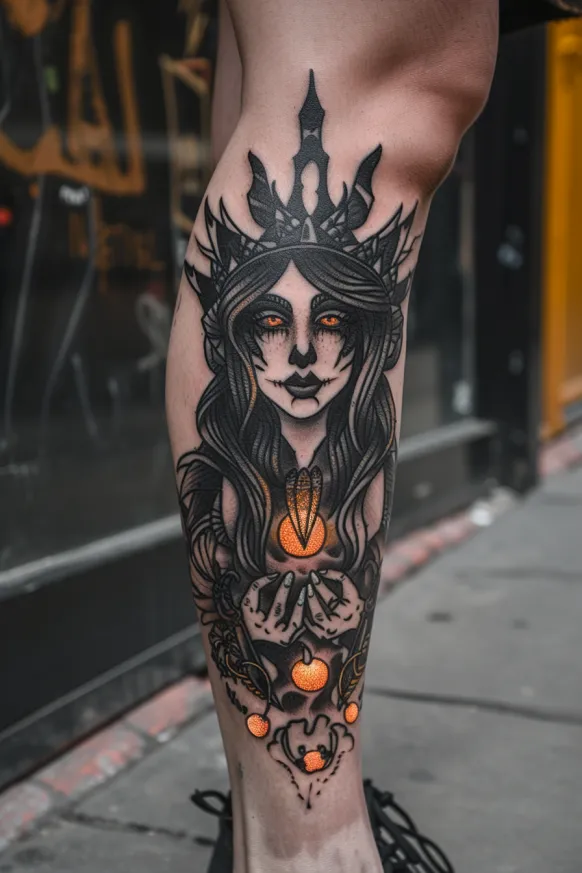Something about this design feels both dangerous and alluring in the best way possible. The contrast between the warm, fiery tones in her eyes and the deep, dark shading of her hair and crown makes the entire piece pop. There s so much personality in this tattoo it s got confidence, mystery, and a little bit of sorcery all wrapped into one. If a tattoo could make someone feel like a goddess of the night, this would be the one.