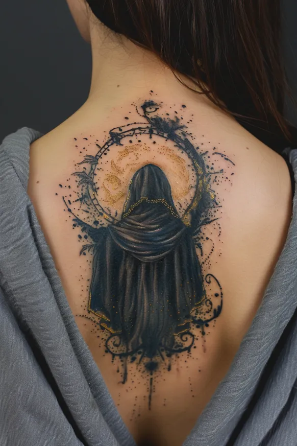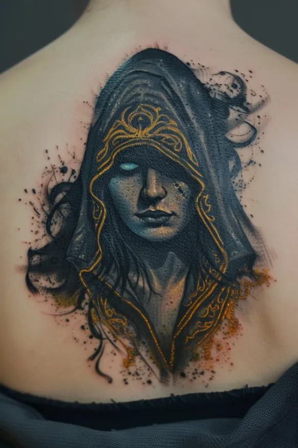 This hauntingly powerful back tattoo brings Hecate s mystical and enigmatic energy to life in a way that feels almost otherworldly. Her face is partially veiled in darkness beneath a deep hood, giving her an air of mystery and quiet authority. Glowing white eyes pierce through the shadows, suggesting divine insight and hidden knowledge. Delicate golden filigree details edge the cloak, adding an ethereal glow against the dark, smoky shading. The contrast between light and shadow makes this design feel alive, like she s emerging from the void itself.