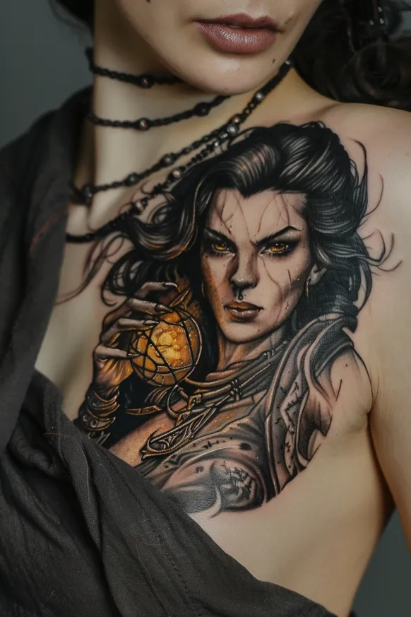 This bold and striking tattoo portrays Hecate as a fierce warrior, radiating raw power and mystery. Her glowing amber eyes seem to hold untold wisdom, while intricate cracks in her skin give her an almost celestial, battle-worn presence. Flowing midnight-black hair frames her intense expression, adding a sense of motion. She clutches a glowing orb, crackling with energy, symbolizing her connection to the unseen forces. The fine details of her armor, jewelry, and mystical markings create a breathtakingly intricate composition that flows seamlessly with the body s natural contours.