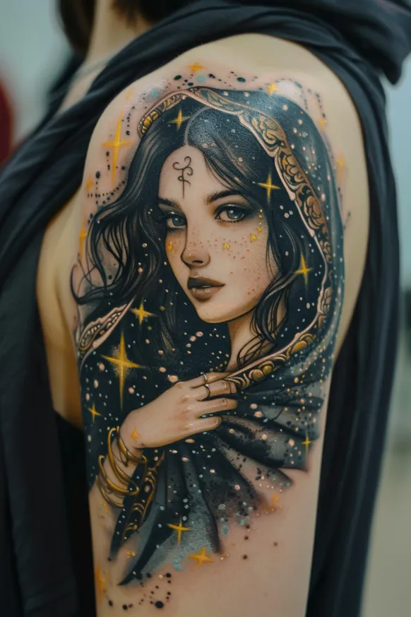 This breathtaking upper arm tattoo captures Hecate in her most celestial form, wrapped in a flowing cloak that seems to merge with the night sky. Her piercing gaze holds an air of mystery, while golden stars shimmer across the fabric, creating an enchanting contrast against the deep black and navy hues. The intricate details in her hood, adorned with delicate golden embroidery, add an almost regal touch. The subtle glow in her eyes and soft freckles give her an ethereal, otherworldly charm.