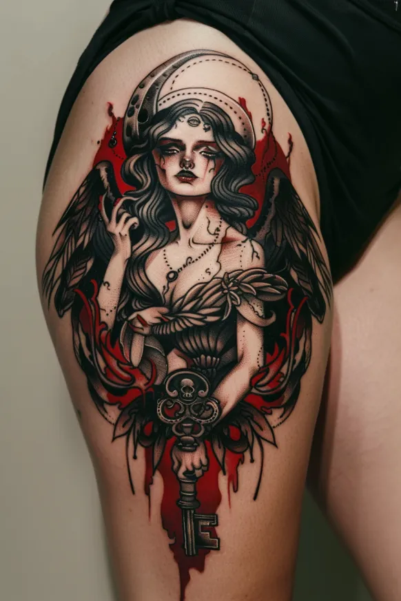 This powerful thigh tattoo brings Hecate s divine presence to life with an incredible mix of mysticism and intensity. She stands with an unwavering gaze, framed by flowing dark hair and celestial markings. Her wings stretch behind her, hinting at her role as a guardian between worlds. In her hand, she holds a large ornate key, symbolizing her power over the hidden and the unknown. Bold red ink splashes in the background, creating a striking contrast against the black and grey detailing. Every line and shadow is meticulously placed, making this piece feel like a true work of art.