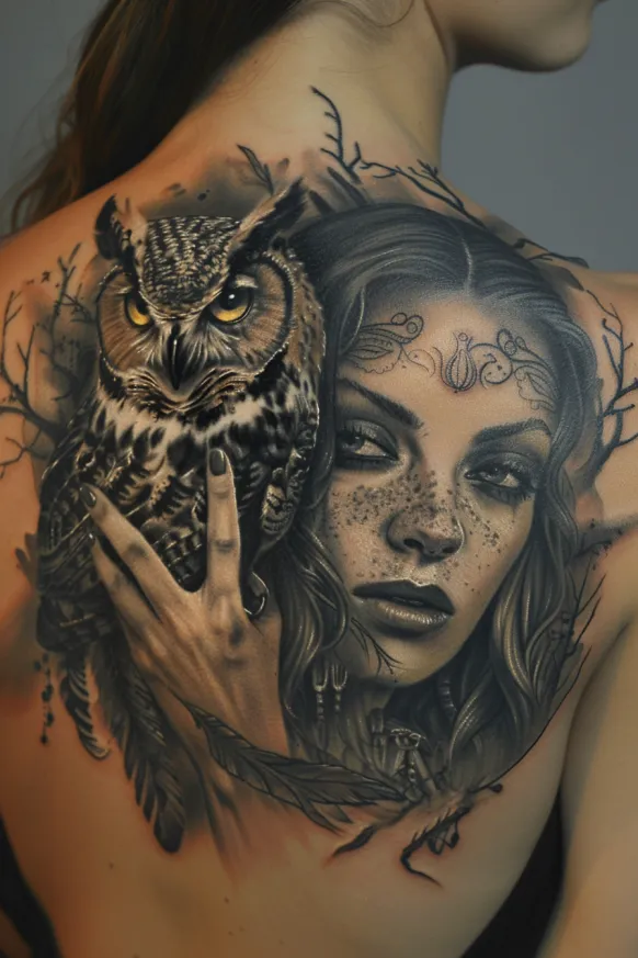 This stunning back piece captures Hecate in her divine, untamed form. Her piercing gaze looks beyond the physical world, framed by intricate witchy symbols etched into her forehead. A great horned owl perches beside her, its amber eyes glowing with an almost human wisdom. The shading in this tattoo is incredibly soft, giving her face a natural, ethereal beauty, while the surrounding elements add a sense of mystical power. Fine details like delicate freckles, windswept hair, and enchanted forest branches blend together seamlessly, creating a design that feels alive with magic.