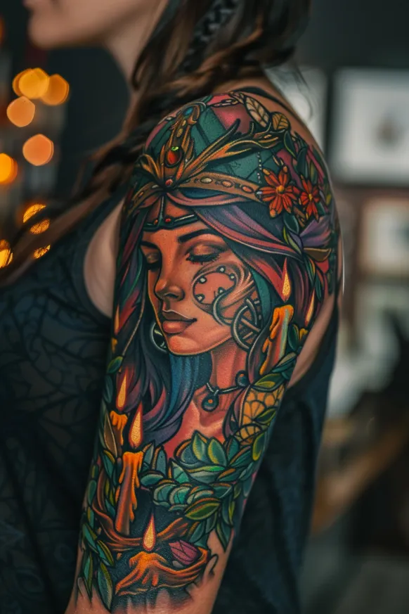 This breathtaking full-sleeve tattoo transforms Hecate into a goddess of nature and magic, blending rich, vibrant colors with intricate mystical details. Her face is calm and serene, framed by flowing hair and an ornate golden headdress that shimmers with elegance. Swirling celestial markings adorn her cheek, hinting at her connection to the mystical realms. Around her, burning candles, lush green vines, and blooming flowers weave together, creating a sense of harmony between earthly energy and divine power. The deep reds, glowing oranges, and lush greens make every detail pop, turning this tattoo into a living, breathing masterpiece.