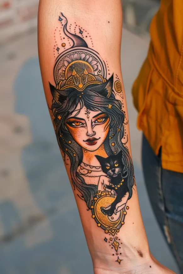 This stunning forearm tattoo brings Hecate s witchy essence to life with a perfect mix of bold colors and intricate details. Her golden eyes glow with a supernatural intensity, framed by long, flowing hair that cascades around her ornate headdress. Delicate gold accents add an air of divine elegance, while a black cat companion clings to a crescent moon mirror, reinforcing her connection to magic and mystery. The balance between warm golden hues and deep black ink makes every element pop, creating a design that is both mystical and visually striking.