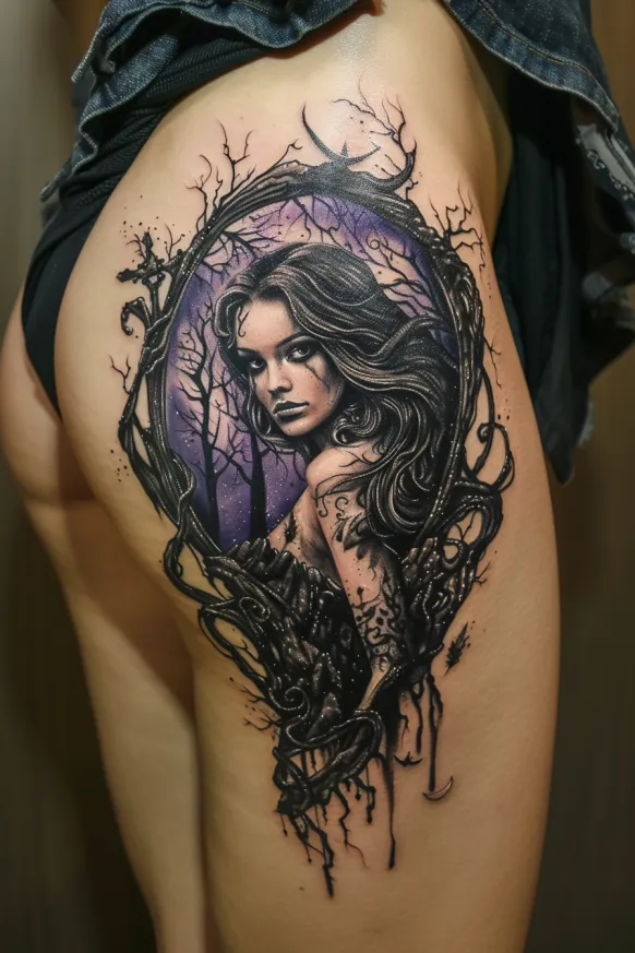 This hauntingly beautiful thigh tattoo brings Hecate s presence to life with a mystical, gothic aesthetic. She gazes through a twisted, overgrown mirror, her intense stare framed by flowing dark hair. The deep purple night sky behind her adds an ethereal glow, giving the entire piece a dreamlike quality. Surrounding the mirror, gnarled branches and shadowy roots weave together, as if they are pulling her between realms. The contrast between soft shading and bold black ink makes this design feel alive with dark enchantment.