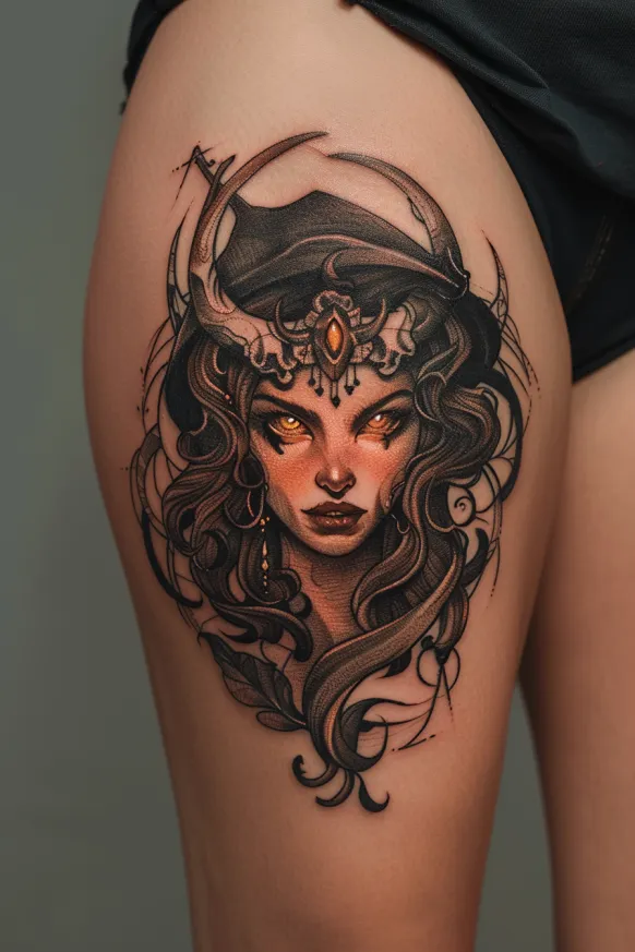 Hecate Dark Sorceress Thigh Tattoo