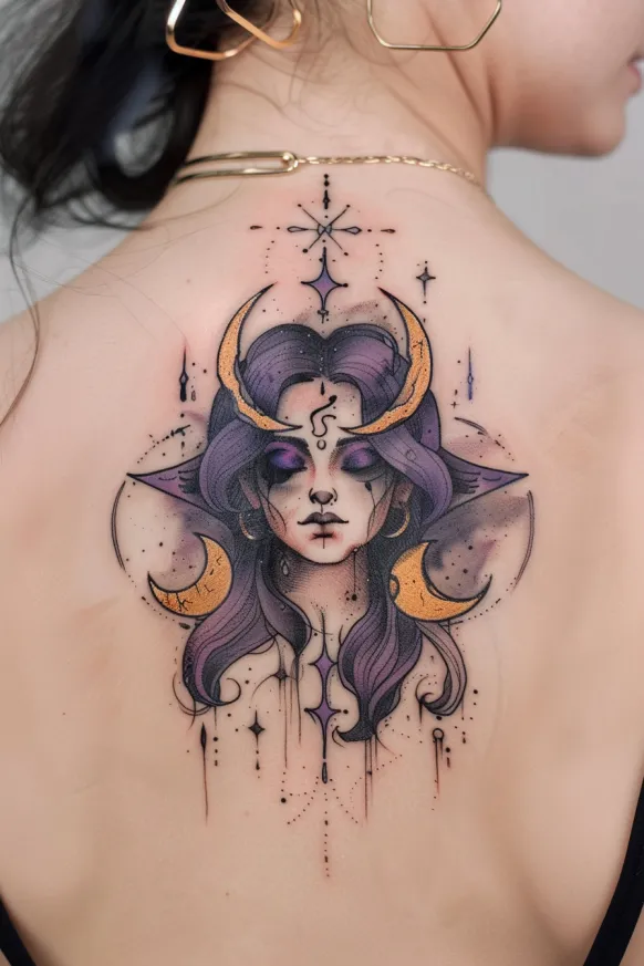 This dreamy back tattoo brings Hecate s celestial energy to life in the most enchanting way. Her face is serene yet powerful, with closed eyes that suggest deep wisdom and an unbreakable connection to the cosmos. Flowing violet hair cascades around her, blending effortlessly with the golden crescent moons that frame her presence. A delicate forehead marking adds a mystical touch, while fine dotwork and tiny starbursts create a soft, ethereal glow. The shading is subtle and graceful, giving this piece a beautifully delicate feel while still radiating strength.
