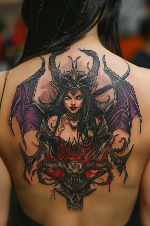 This bold and electrifying back tattoo captures Hecate in her most intense and commanding form. Her piercing glowing red eyes, sharp horns, and flowing midnight-black hair create an aura of raw power and mysticism. With her majestic purple wings spread wide, she exudes both grace and danger, embodying the balance between wisdom and chaos. Below her, flaming demonic skulls burn with an eerie red glow, symbolizing her connection to the underworld and unseen forces. Every detail, from the ornate crown on her head to the intricate shading of her wings, adds to the dramatic, almost supernatural effect of this design.