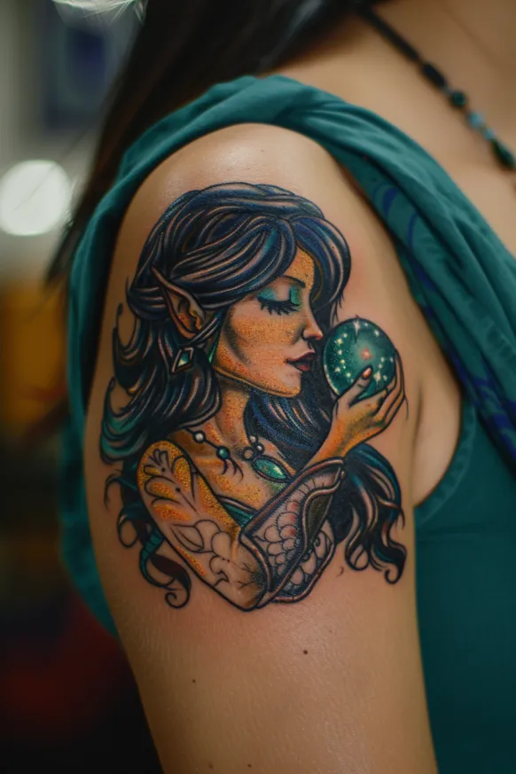 This enchanting tattoo brings Hecate s divination power to life with an ethereal, magical aesthetic. The goddess is depicted as a mystical elf-like figure, her delicate pointed ears adding a touch of fantasy charm. Rich shades of blue and teal give depth to her flowing hair, while shimmering gold details highlight her ornate jewelry and armor. The glowing crystal ball she holds radiates mystery, drawing attention to the all-seeing wisdom she represents.