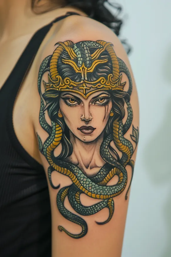 There s something so mesmerizing about this piece. The way the snakes intertwine with her hair makes the whole tattoo feel alive, as if it s constantly shifting. I love how the gold accents add a goddess-like glow, making her look both divine and untouchable. If you re drawn to tattoos that radiate power, mystery, and a hint of danger, this one is an absolute masterpiece.