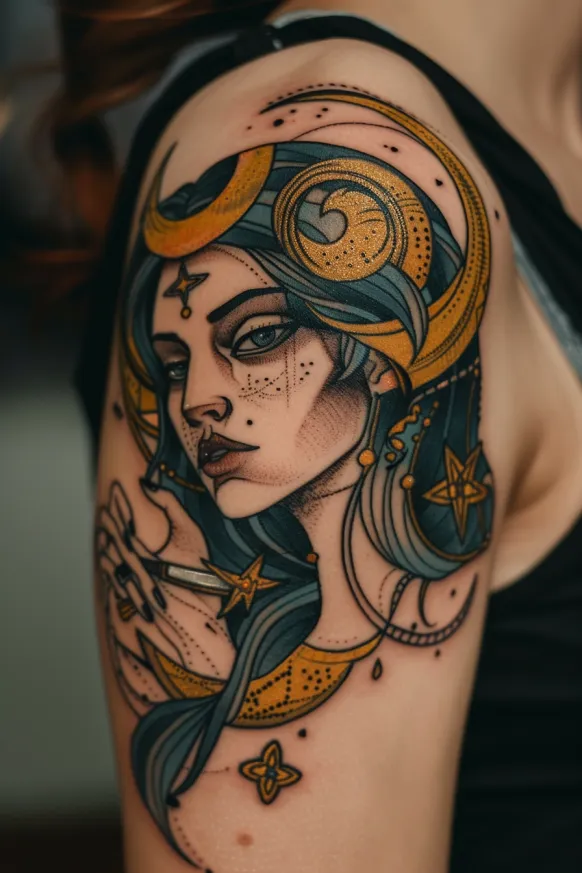 Everything about this tattoo radiates power and beauty. I love how the rich color palette brings out the mystical energy of the design without overpowering the delicate details. The way the moons and stars blend seamlessly into her hair and jewelry makes it feel like she is part of the cosmos itself. It s graceful, enchanting, and effortlessly bold, perfect for anyone who wants a timeless piece of divine feminine energy on their skin.
