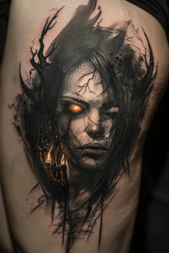 This is the kind of tattoo that gives chills in the best way. The contrast between the soft shading and jagged cracks makes her look both ethereal and powerful. That single burning eye is just mesmerizing, like she s seeing straight into your soul. I love how the smoky textures and eerie lighting make her feel like she s stepping right out of the underworld. If you re after a tattoo that s hauntingly beautiful, this one is pure magic.