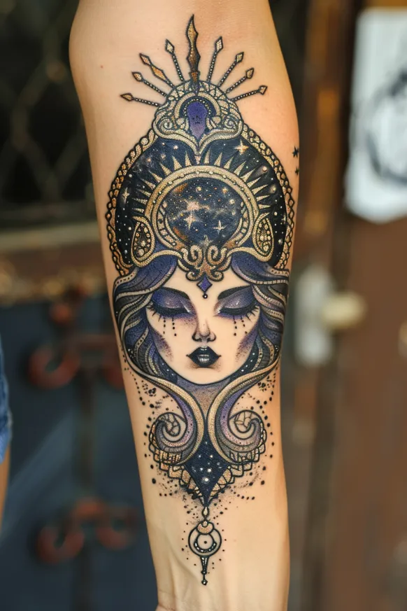 This stunning forearm tattoo brings Hecate s celestial essence to life with an intricate blend of cosmic and mystical elements. Her face, serene and powerful, is framed by an elaborate ornate headdress that holds a swirling galaxy, making it seem like the universe itself is resting upon her crown. Deep shades of midnight blue and gold accents create a sense of otherworldly magic, while the delicate detailing in the jewelry and facial markings adds an extra touch of elegance.