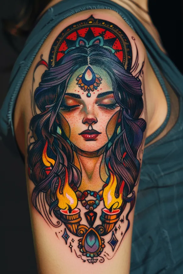This tattoo is pure magic. The way the warm flames contrast against the cool tones of her hair makes everything feel alive and electric. I love how her soft expression carries so much strength, like she holds the secrets of the universe but shares them only with those who truly seek them. The balance of mysticism and bold artistry makes this a design that commands attention. If you want a tattoo that radiates power, beauty, and otherworldly wisdom, this one is absolute perfection.