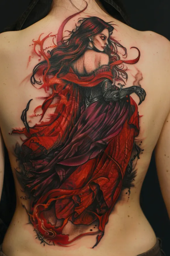 This tattoo is absolutely breathtaking. The way the rich red tones contrast against the deep black shadows makes everything feel alive and electric. I love how her expression is both fierce and alluring, as if she s daring you to step into her world. The flowing composition and dynamic movement make this design feel like it tells a story of strength, transformation, and mystery. If you re looking for a tattoo that is bold, dramatic, and dripping with sorceress energy, this one is pure magic.