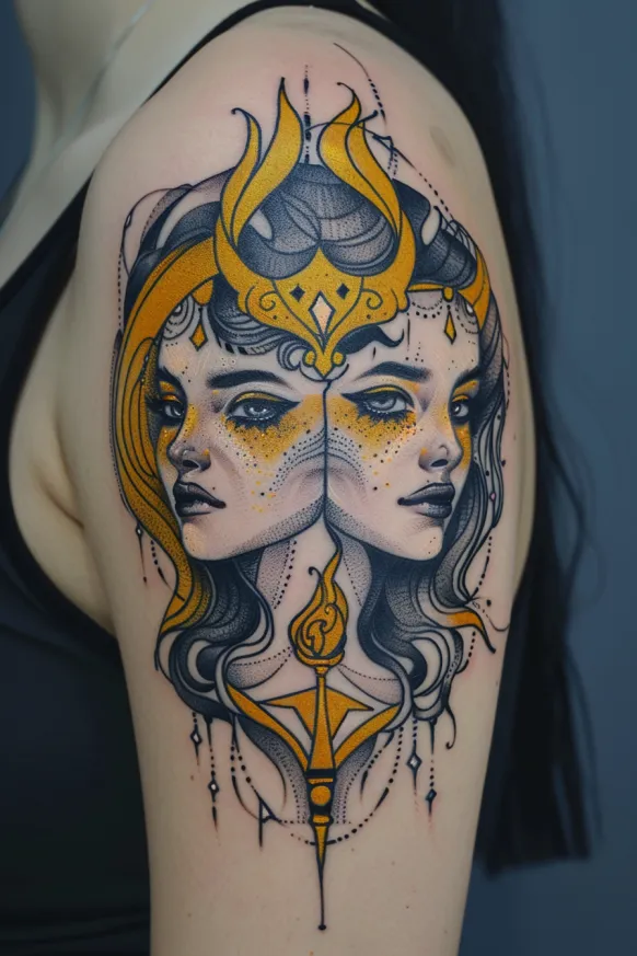 This tattoo is pure magic. The way the golden hues glow against the deep black ink creates an effect that feels almost otherworldly. I love how the sharp, clean lines and intricate dotwork make every detail pop. There s something so captivating about the mirrored faces, like they re staring straight into your soul. If you love tattoos that feel bold, mystical, and utterly mesmerizing, this one is a total masterpiece.