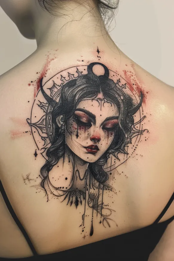 This hauntingly beautiful back tattoo captures Hecate in a way that feels both delicate and powerful. Her face is serene yet intense, framed by flowing braids and celestial horns. A mystical halo-like design encircles her head, adorned with intricate dotwork and geometric patterns that enhance the otherworldly aura. Soft red accents around her eyes and cheeks create a dramatic contrast against the black and grey shading, making her expression feel almost ghostly yet enchanting. Tiny dripping ink details add a sense of raw emotion, making this piece look like it was drawn straight from a dark fairytale.