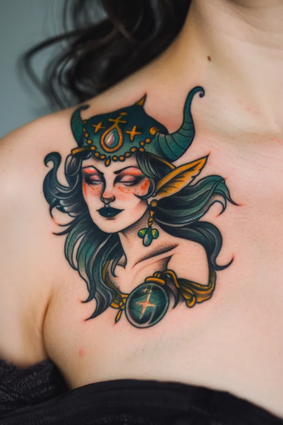 This stunning tattoo captures Hecate in a fantastical, otherworldly form, blending elements of mythology and magic. Her flowing green hair shimmers with depth, while her horned crown adorned with golden details enhances her regal and mystical presence. The sharp elf-like ears add an ethereal touch, as if she exists between the realms of gods and spirits. A glowing orb rests on her chest, pulsing with unseen power, as if she s harnessing the very essence of moonlit divination. The bold contrast of deep shadows and glowing highlights gives the tattoo a sense of depth and movement, making it truly mesmerizing.