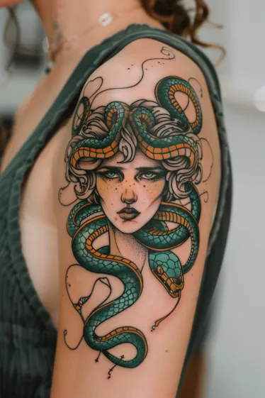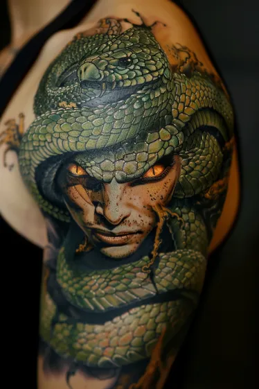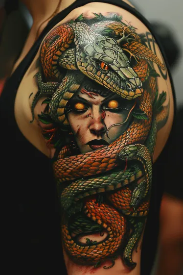 Hyper-Realistic Medusa Shoulder Tattoo with Coiled Serpent