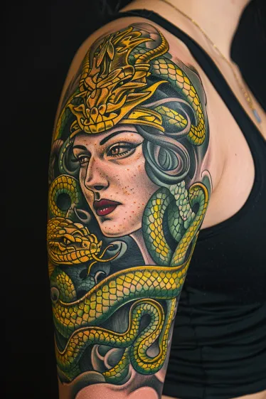 This bold and colorful Medusa tattoo stretches across the upper arm in stunning neo-traditional style. Her face is framed by deep, flowing hair, with golden-green serpents slithering around her. Each scale is shaded with precision, creating a sense of movement and texture. A golden snake-shaped crown sits on her head, reinforcing her powerful, almost divine presence. Her deep red lips and piercing eyes add a touch of mystery, making this piece feel both regal and intimidating.