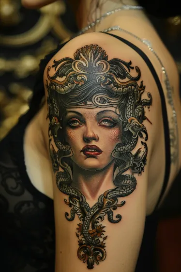 Elegant Medusa Shoulder Tattoo with Ornate Frame
